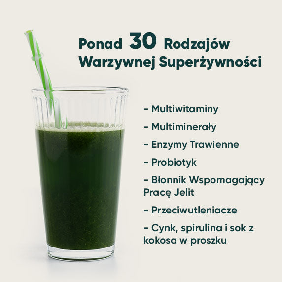 Ponad 30 bogatych w składniki odżywcze superfoods, od spiruliny i chlorelli po jarmuż i brokuły, w połączeniu z niezbędnymi witaminami i minerałami wspomaga metabolizm i pomaga utrzymać naturalną odporność organizmu — wszystko to w naturalnej postaci, bez dodatku cukru.